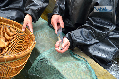 【水务局、公证处工作人员监督测量放流苗种规格】